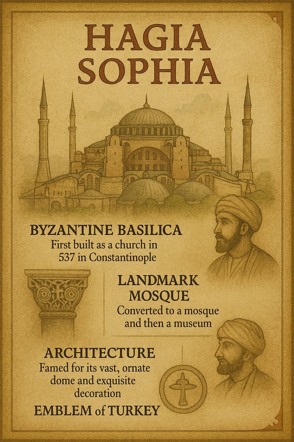 The most iconic structure of all, the Hagia Sophia, was commissioned by Emperor Justinian I in 537 AD. Its enormous central dome—seemingly suspended by light—was a marvel of mathematics and faith. The design inspired countless churches and later mosques, influencing architecture from Greece to Persia and beyond.