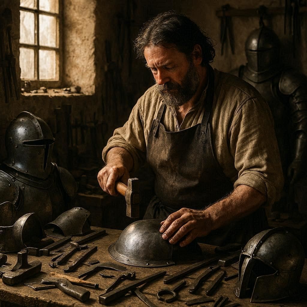 Medieval armour was crafted by specialist armourers, a highly skilled group of blacksmiths trained to shape iron and steel into protective equipment. As demand grew, armour production became more organised and specialised.