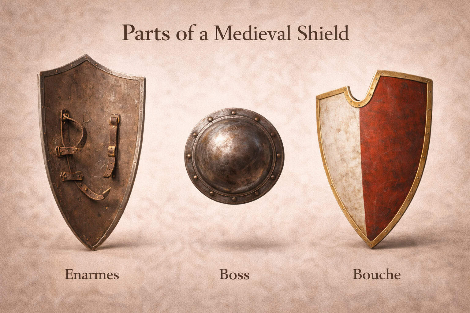 There were three common parts associated with medieval shields namely the Enarmes, Bouche, and the Boss. The Enarmes was a leather strap attached to the back of the shield that was used by soldiers to carry the shield.