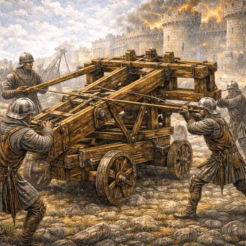 A large siege engine that used counterweight mechanics to hurl massive stones at castle walls, making it one of the most destructive weapons of the Middle Ages.