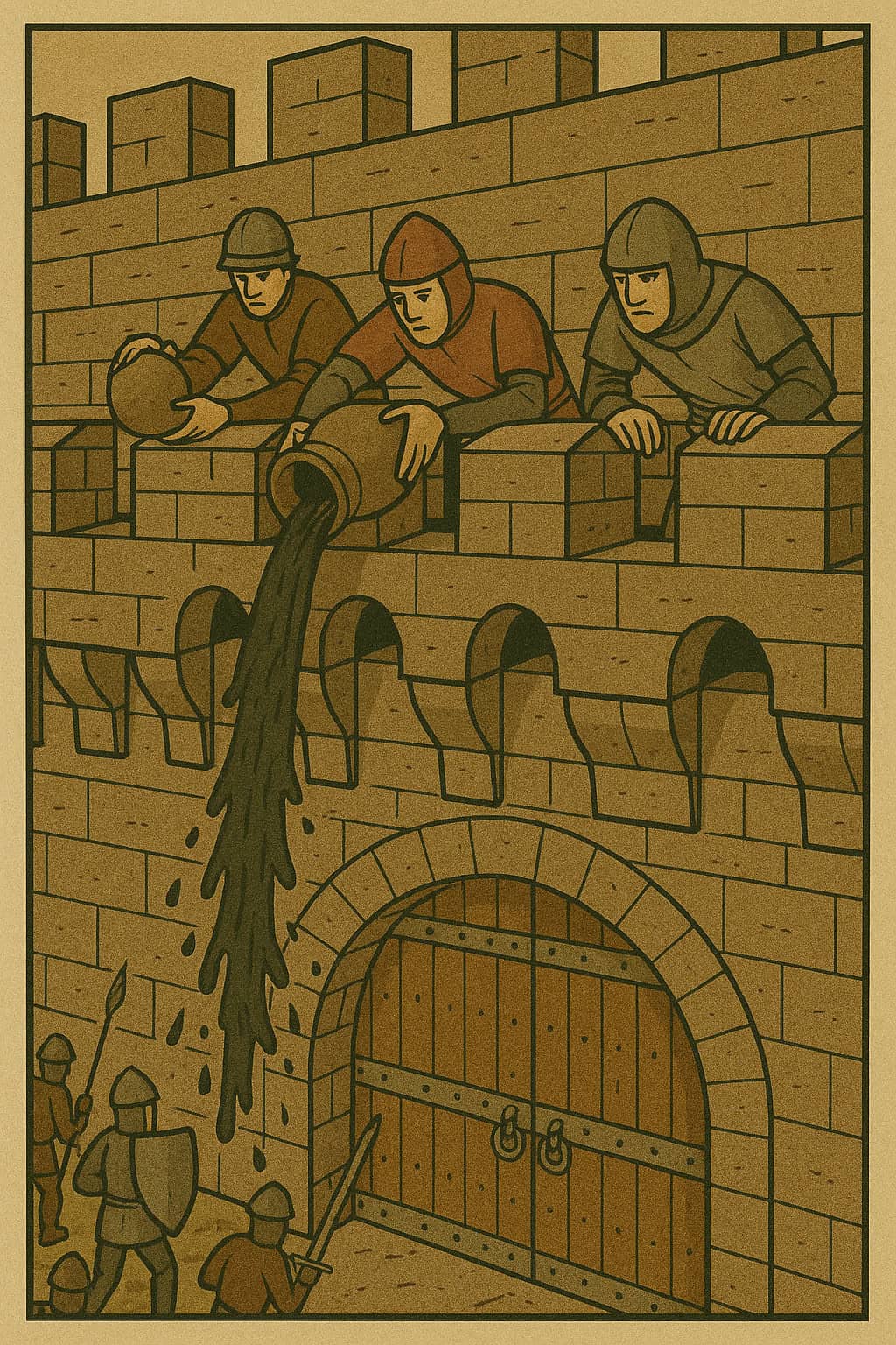 • Murder holes through which defenders poured boiling liquids or dropped stones.