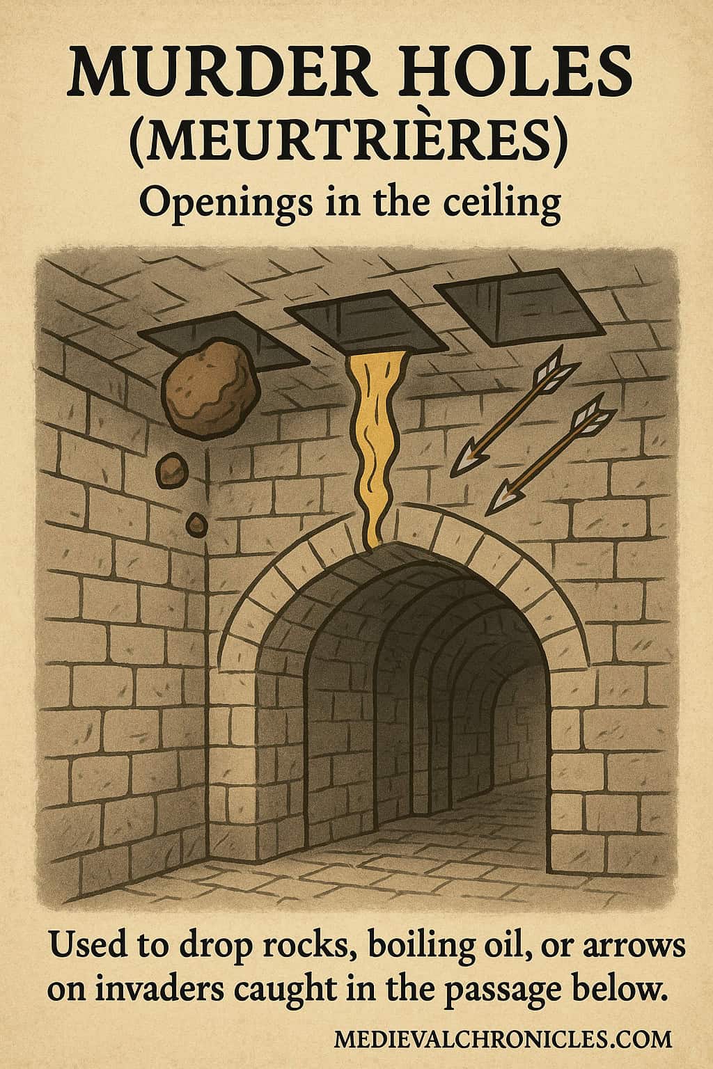 • Murder holes: Openings in the ceiling of the gateway for dropping hot oil, sand, or stones.