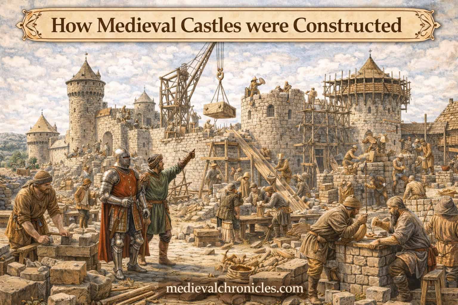 Medieval castles were constructed through carefully planned engineering that combined stone masonry, skilled labor, defensive design, and vast financial resources. Builders began with strategic site selection and strong foundations before raising thick curtain walls, towers, and gatehouses. Using materials such as stone, timber, lime mortar, and iron, castle construction often took 10 to 20 years and required hundreds of workers — resulting in fortified structures that symbolized power, security, and political control throughout the Middle Ages.