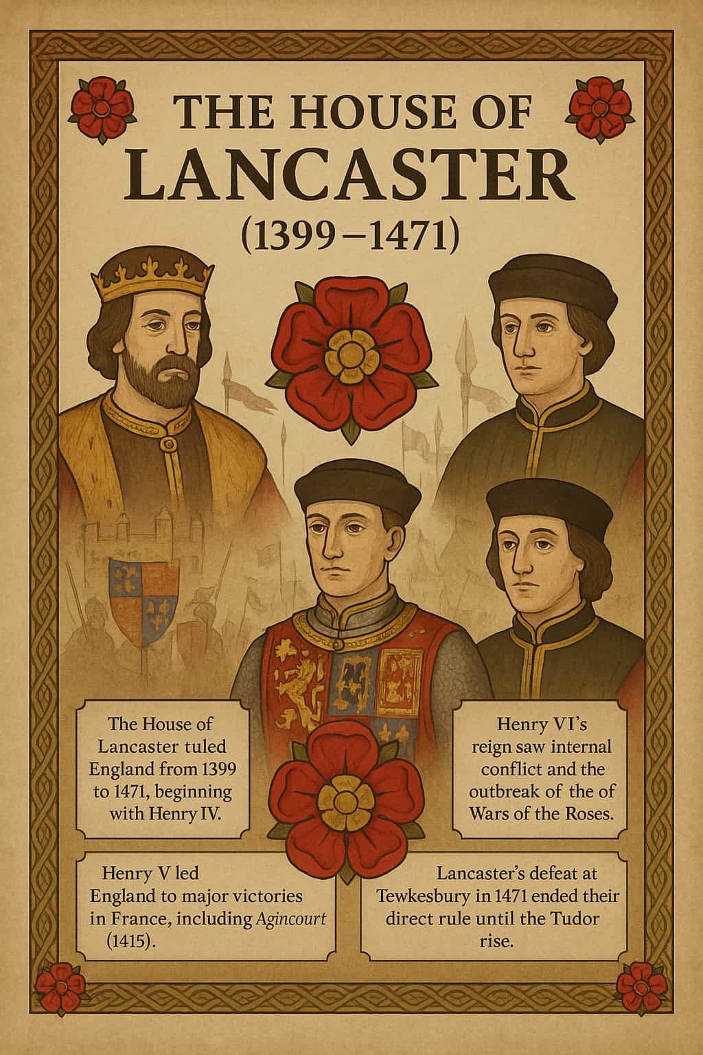 Lancastrian kings included Henry IV, Henry V, and Henry VI. Their reigns covered military triumphs such as Agincourt, as well as political collapse during Henry VI’s mental illness.