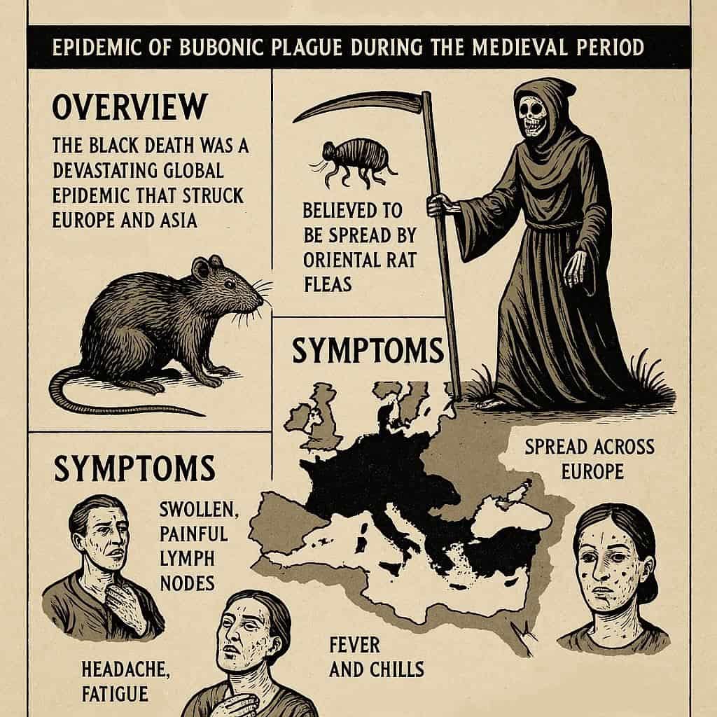 The Black Death, also known as the Bubonic Plague, the Great Plague, or simply The Plague, was one of the most catastrophic pandemics in human history. Emerging in the mid-14th century, it swept relentlessly across Europe, Asia, and North Africa, killing tens of millions of people and wiping out entire communities within months. The plague did not discriminate — peasants, merchants, and nobles alike fell victim to the terrifying disease that seemed to strike without warning. Beyond the staggering loss of life.