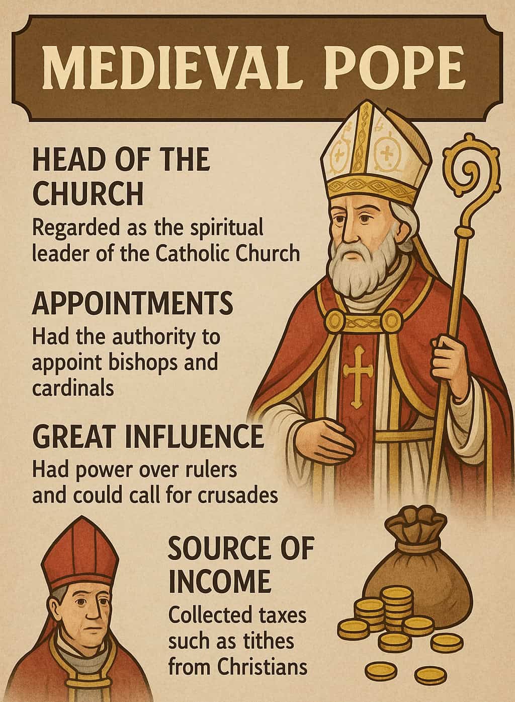 Religion was the foundation of medieval society, influencing politics, education, art, and daily life. The Catholic Church held spiritual and temporal authority, while monasteries preserved learning and sacred texts. Regular participation in mass, confession, and pilgrimages shaped individual belief and community life. The medieval period was defined by faith, ritual, and the intertwined power of church and state.