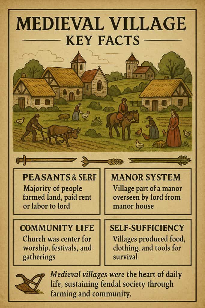 Medieval villages existed within the feudal system, which linked peasants to lords through obligations rather than wages. In most cases, the lord owned the land and granted peasants the right to farm it in return for services that sustained the manor’s economy.