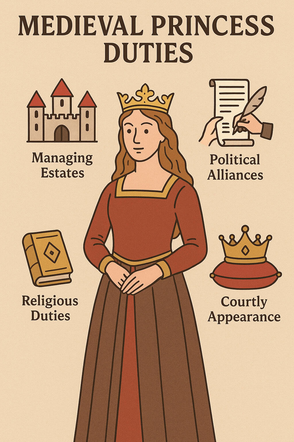 A medieval princess was responsible for charity, household management, and social duties. She could also play a role in political affairs, advising on governance or attending councils.