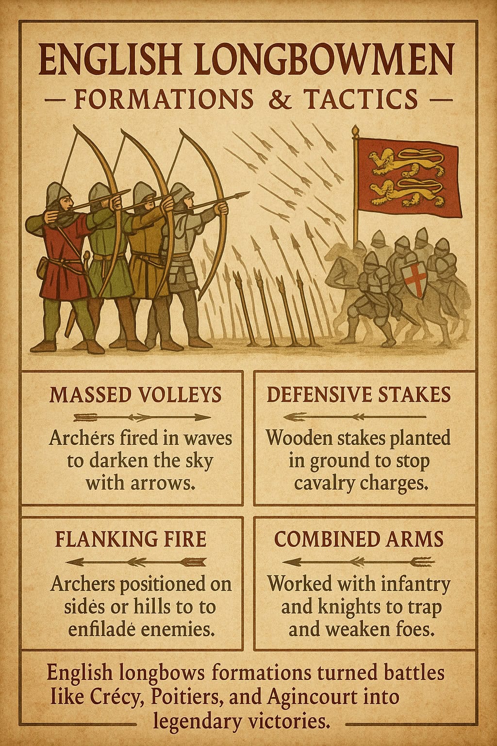 Longbowmen fired thousands of bodkin-tipped arrows simultaneously, capable of piercing armor and devastating enemy formations.