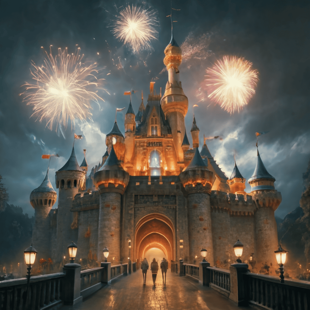 fireworks going off outside a medieval castle c